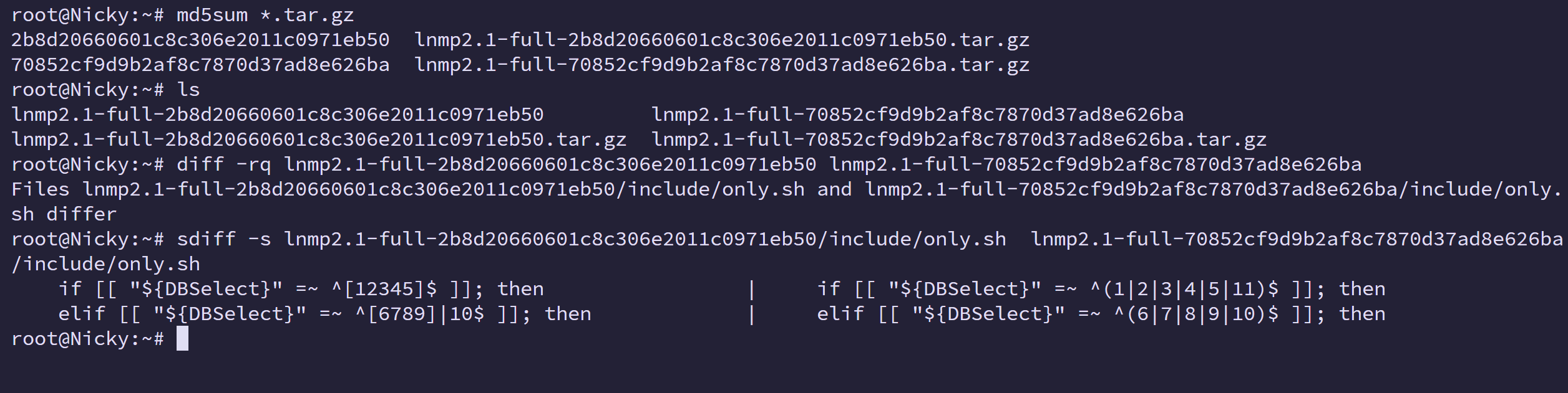 root@Nicky:~# diff -rq lnmp2.1-full-2b8d20660601c8c306e2011c0971eb50 lnmp2.1-full-70852cf9d9b2af8c7870d37ad8e626ba